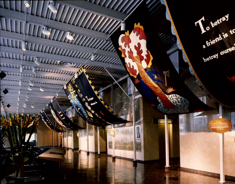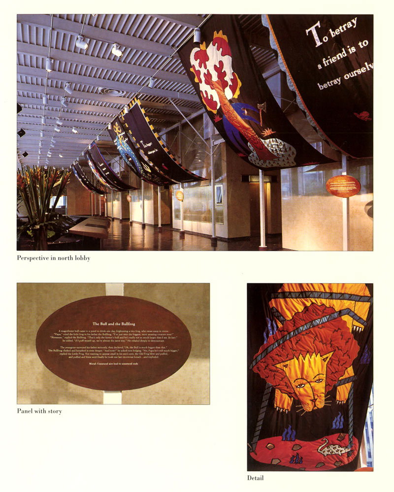 The owners of the building, Mitsui Fudosan, were having the asbestos removed from the ceiling of the Lobby. In order to distract the tenants from the temporary scaffolding that was put up, with Diana Graham Design we designed this exhibition of Aesop’s Fables. The large flags illustrated the fable and included the moral of the story. The stories of the fables were told on elliptical faux painted panels below the story.