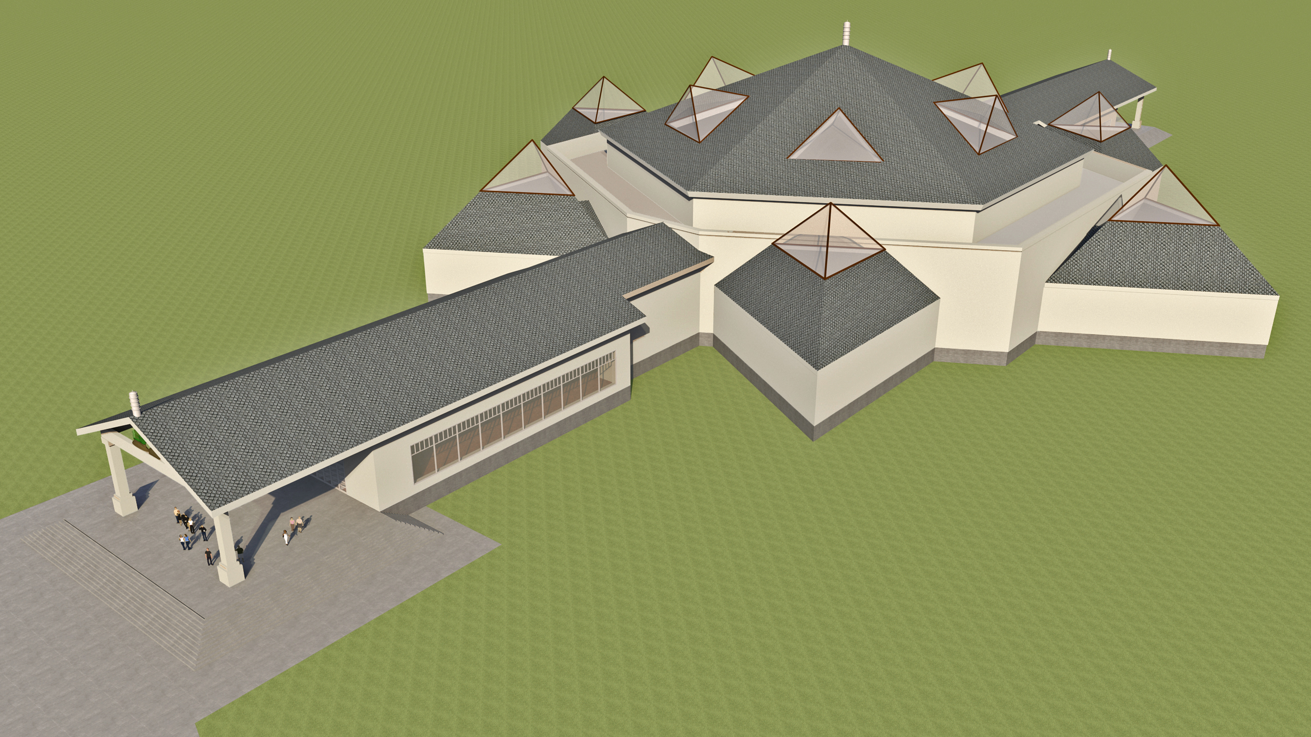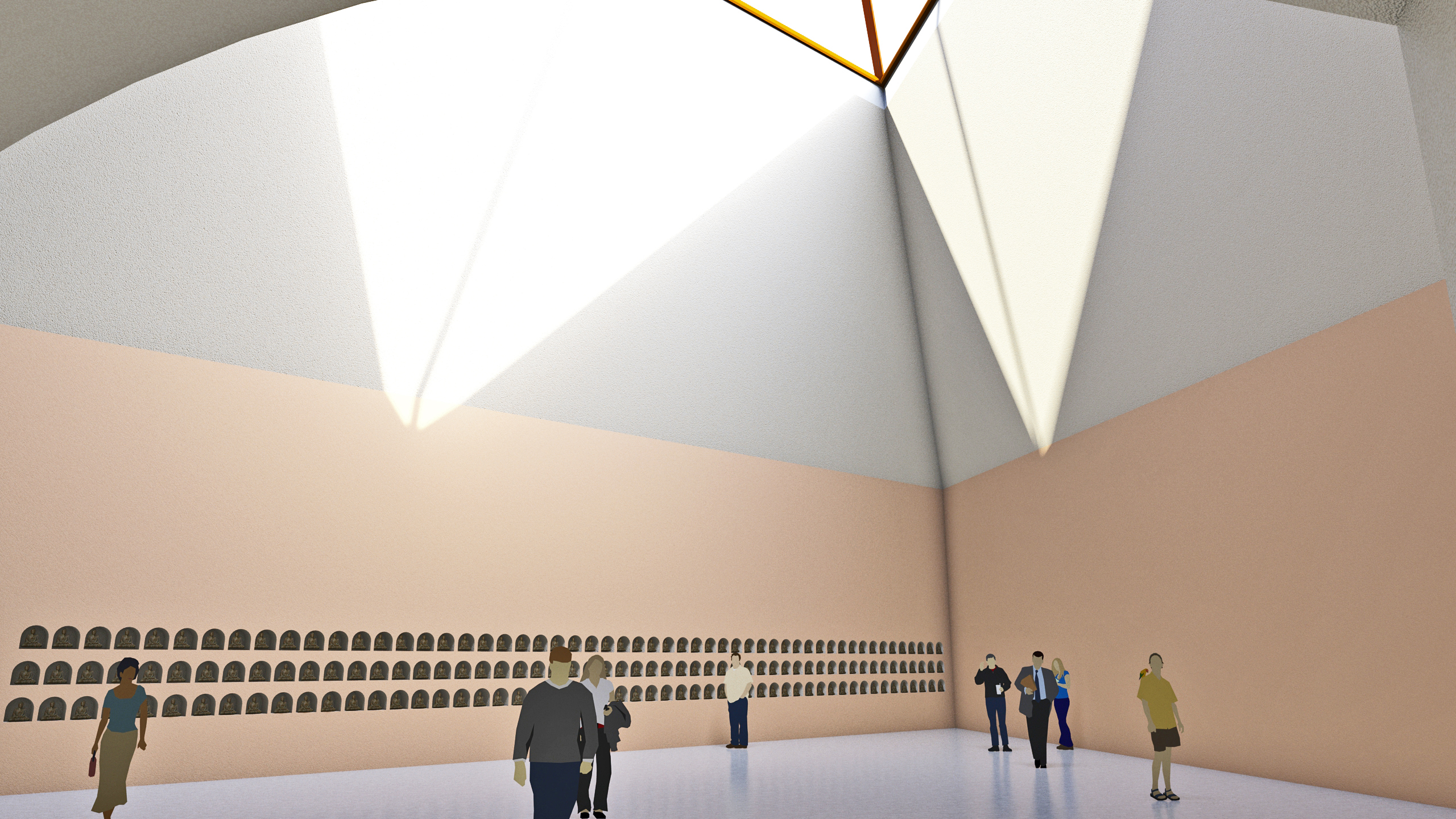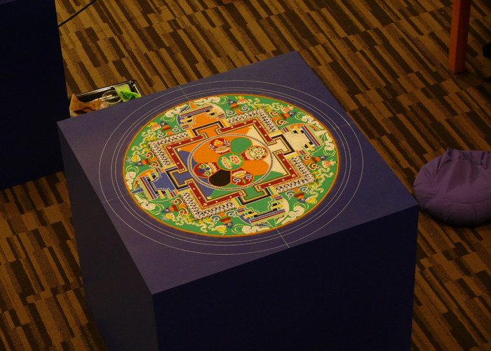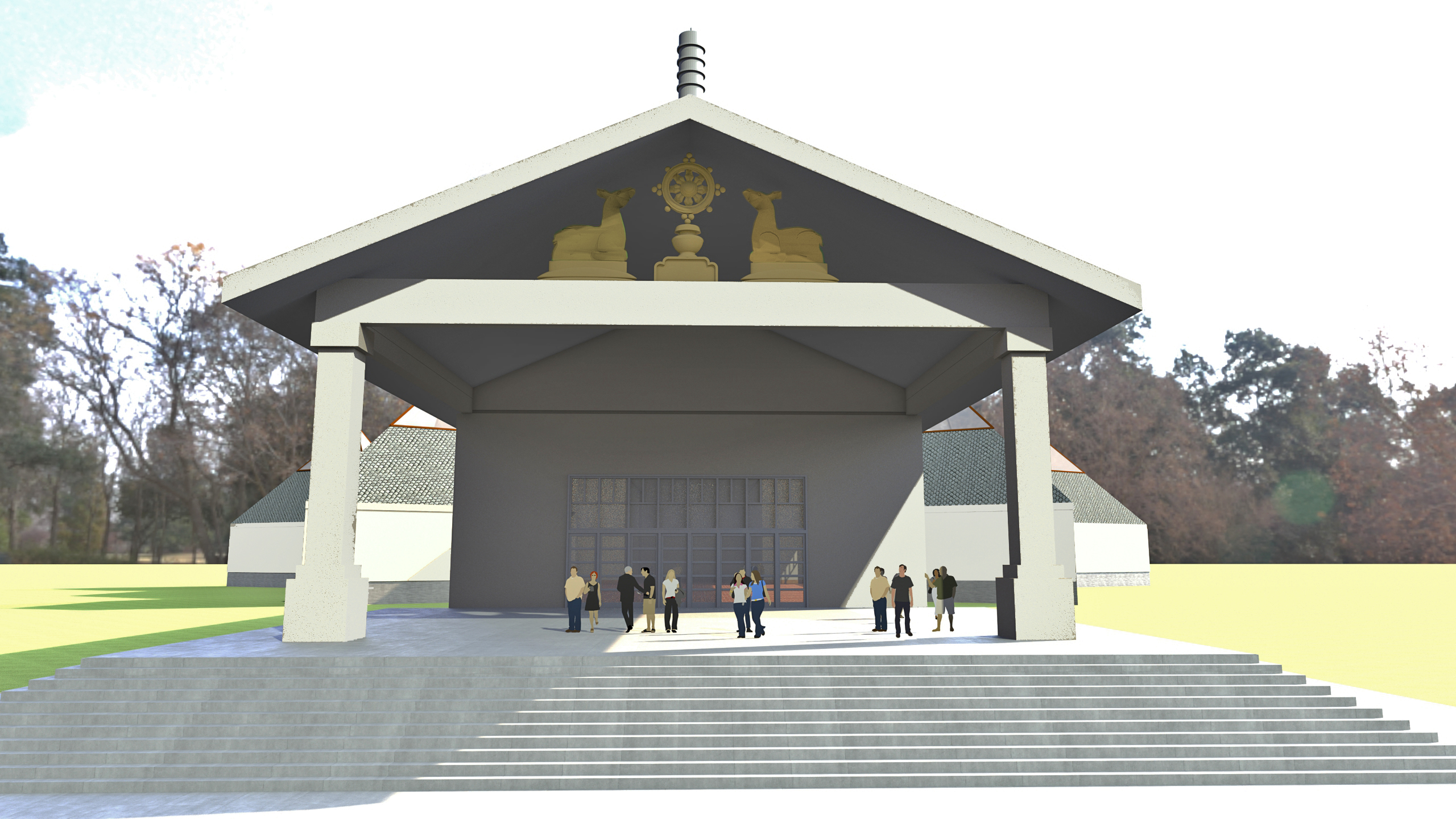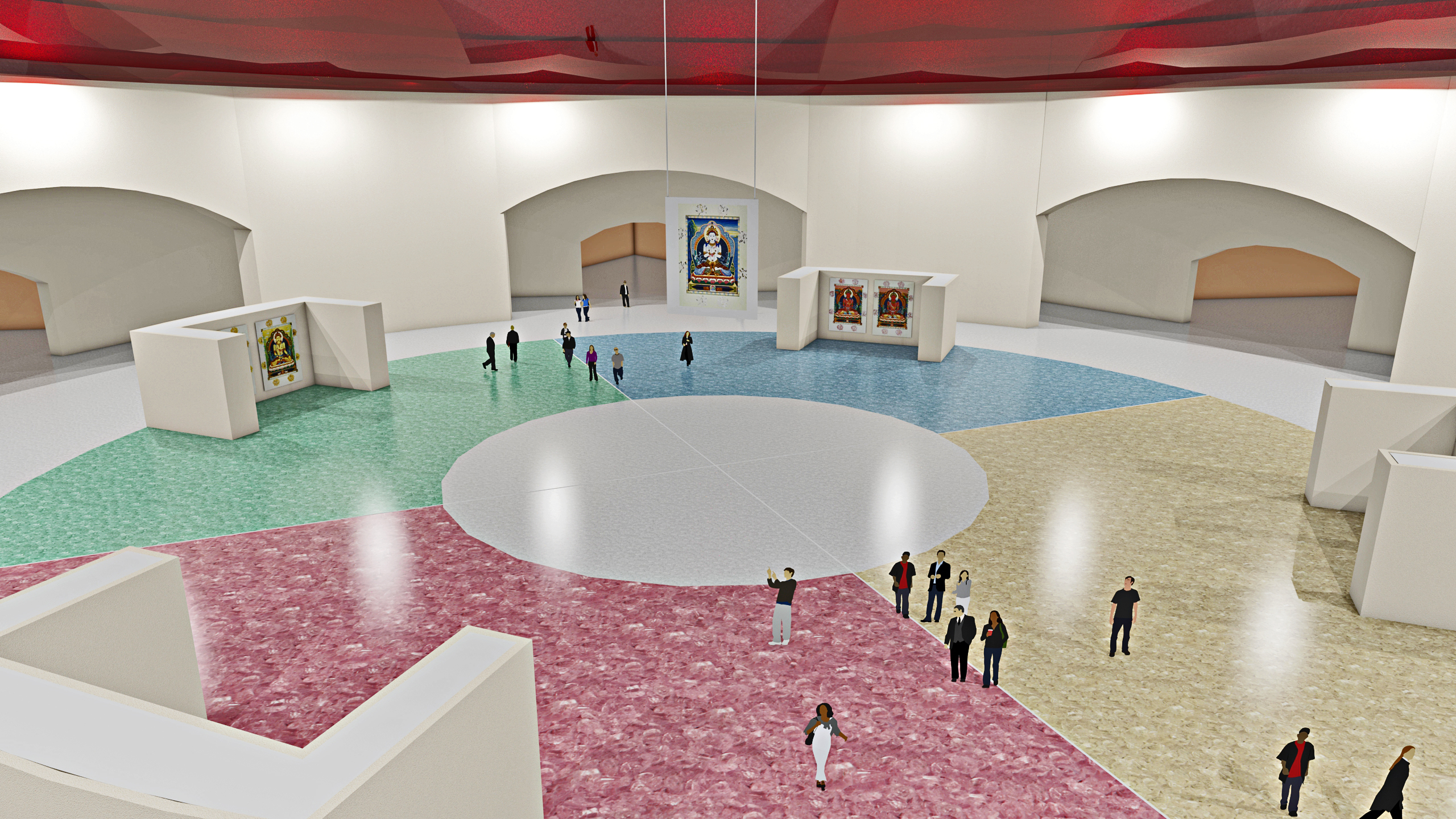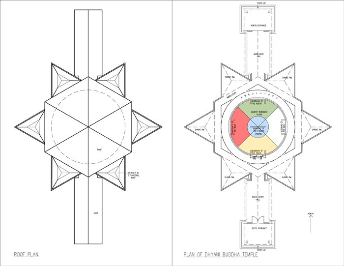 The artist, Joan Bredin-Price, painted five pairs of male and female Buddhas, the Dhyani Buddhas. After seeing the paintings, I was inspired to create a project of a temple to house them. The plan of the temple is a planar projection of two intersecting tetrahedrons; another name for this is a Merkabah. The building is oriented on a North-South axis with ceremonial entrances on the North and South. The central space is elevated three steps and is surrounded by two ambulatories. An elliptical dome over the central space is designed to have a sound source at its focal point so the whole space can be filled and tuned with particular sounds. Each of the five pairs of Buddhas is associated with a color in the Tibetan Buddhist tradition. These colors are expressed in the color of the grout of the terrazzo floor made of quartz crystals. There are six shrine rooms off each side of the hexagonal plan. The shrine rooms are double-height, triangular-shaped rooms capped with tetrahedral skylights above. The temple is heated and cooled using a combination of geothermal and solar mechanical systems. The Dhyani Buddha paintings and temple proposal were exhibited at the Amherst College Library in the Fall of 2011. We are looking for donors to finance this $4.5 million project.