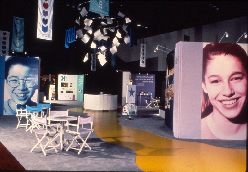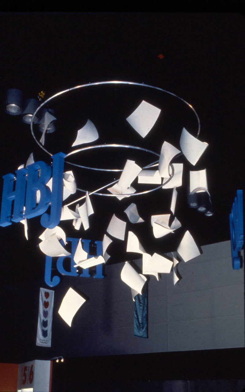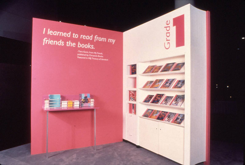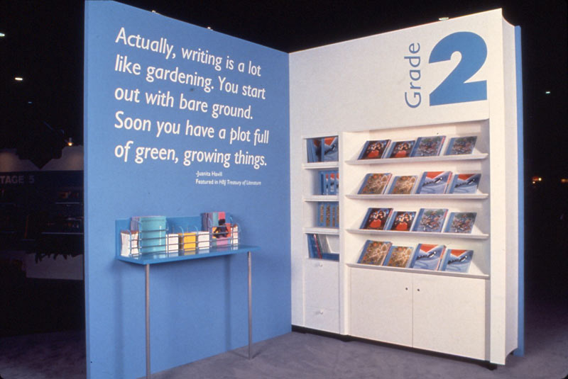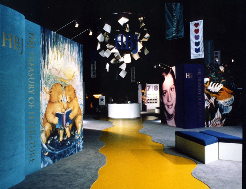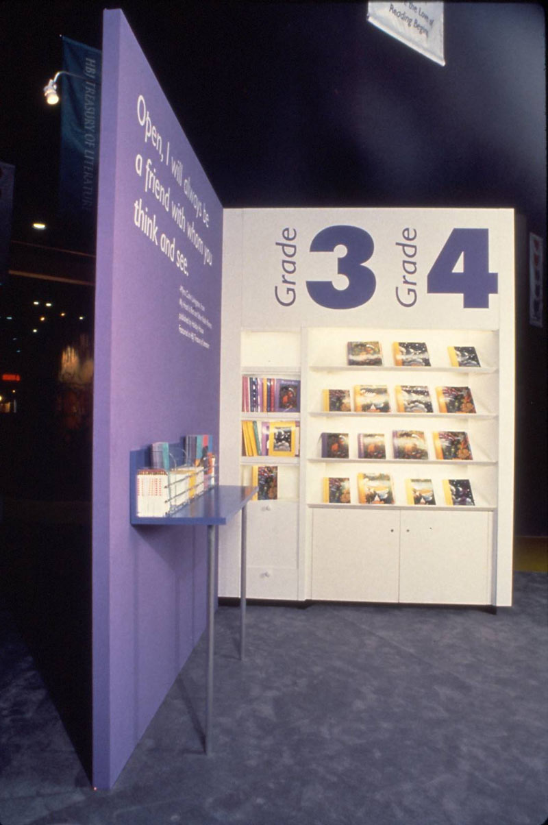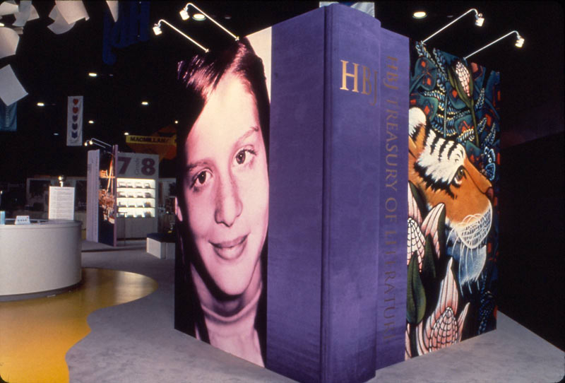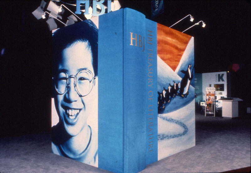 Designed for the graphic design firm Frankfurt Balkind. The publisher, Harcourt Brace Jovanovitch, issued new text books for grades 1 through 6 and wanted to creatively display them. We designed a display for each textbook that was the textbook itself, 8 ft. high and opened to create a display space. The covers of these large “books” included on one side the actual book cover and on the other side a photo of a child from that grade.